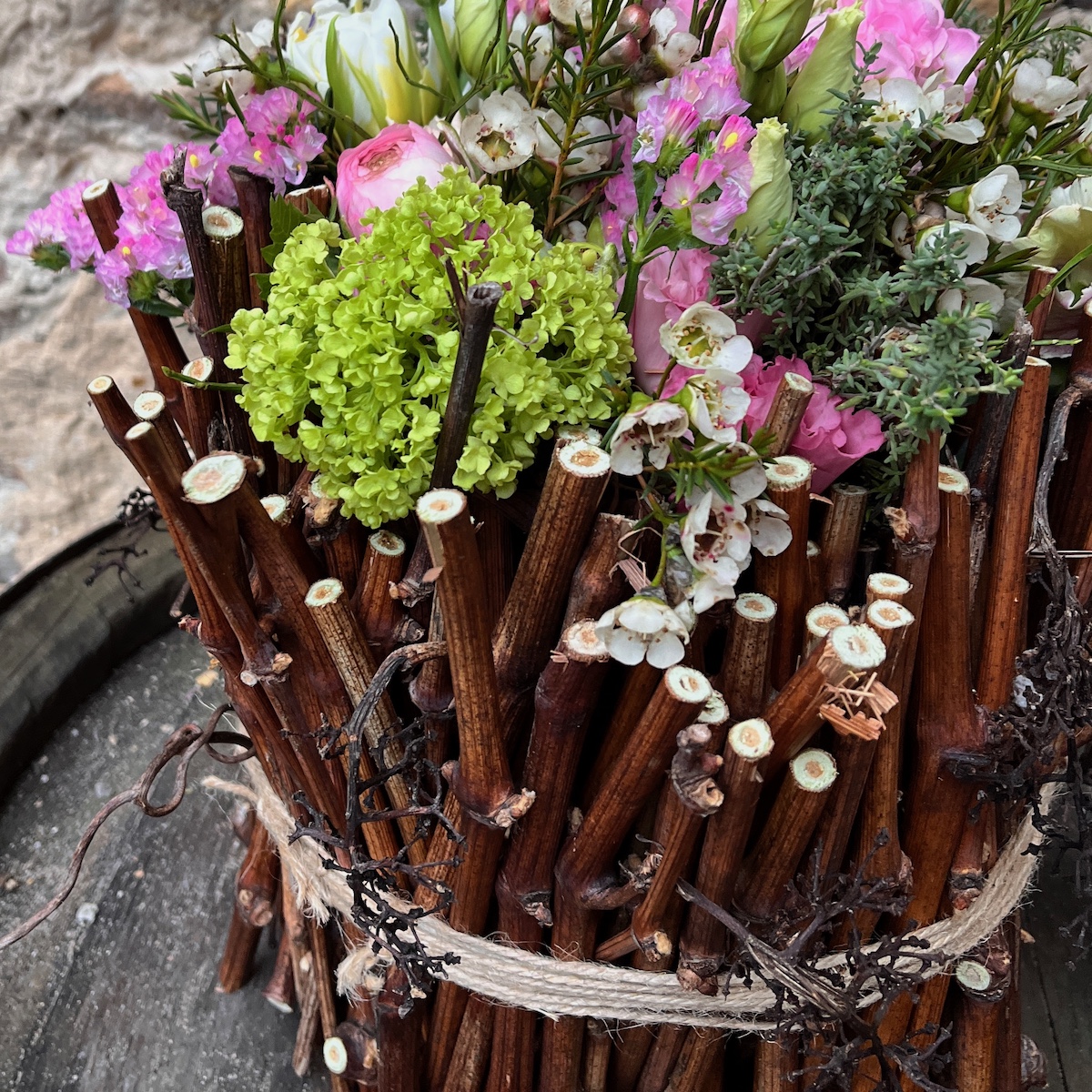 Florales Kunstwerk: Weinrebenbündel veredelt mit frischer Blumenfüllung