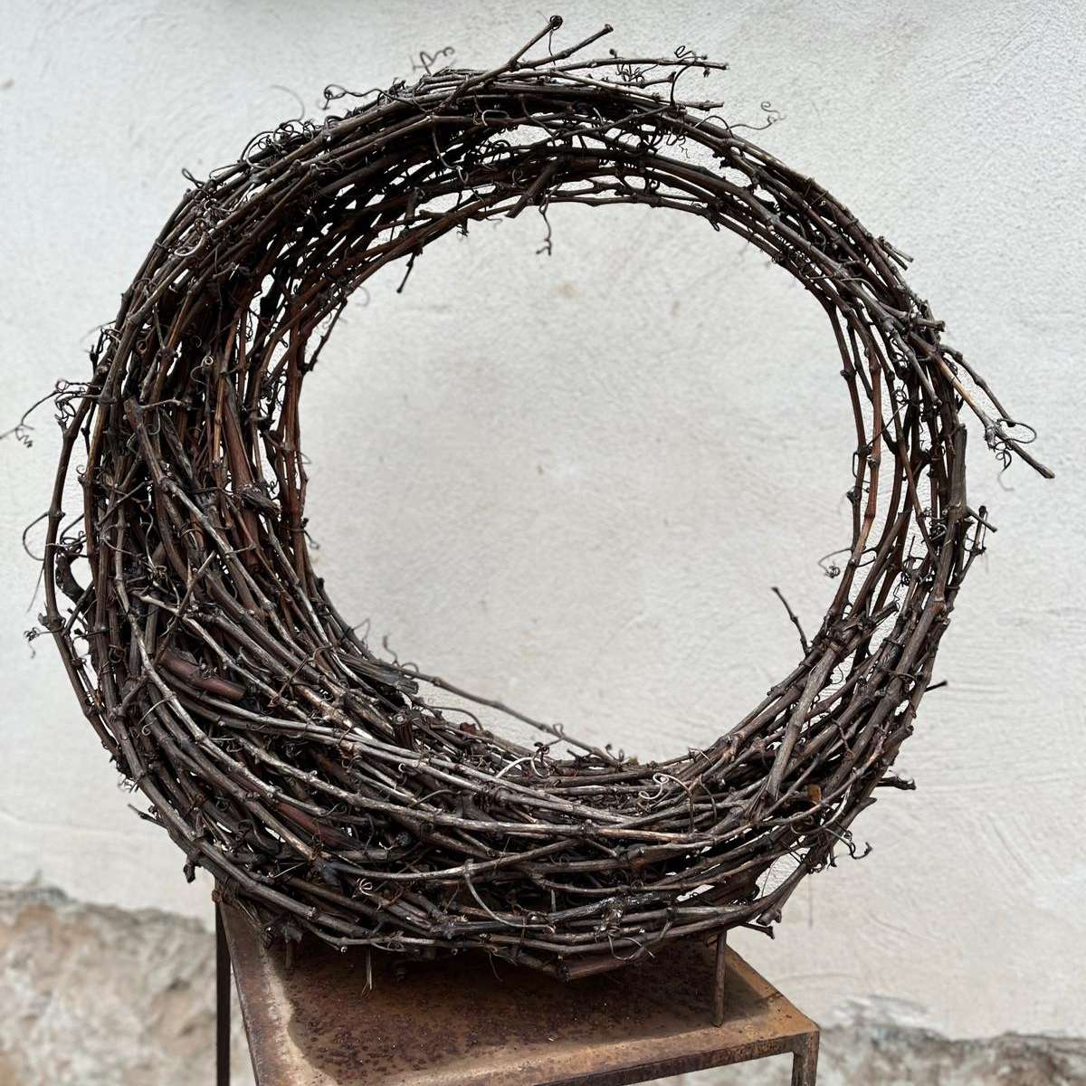 Schritt für Schritt entsteht ein individueller Kranz mit einem Durchmesser von ca. 60–80 cm, der sowohl als Wandobjekt als auch frei stehend ein besonderer Blickfang ist. Die gewachsenen Reben verleihen dem Werkstück Tiefe, Bewegung und Charakter – jedes Stück ist ein Unikat.